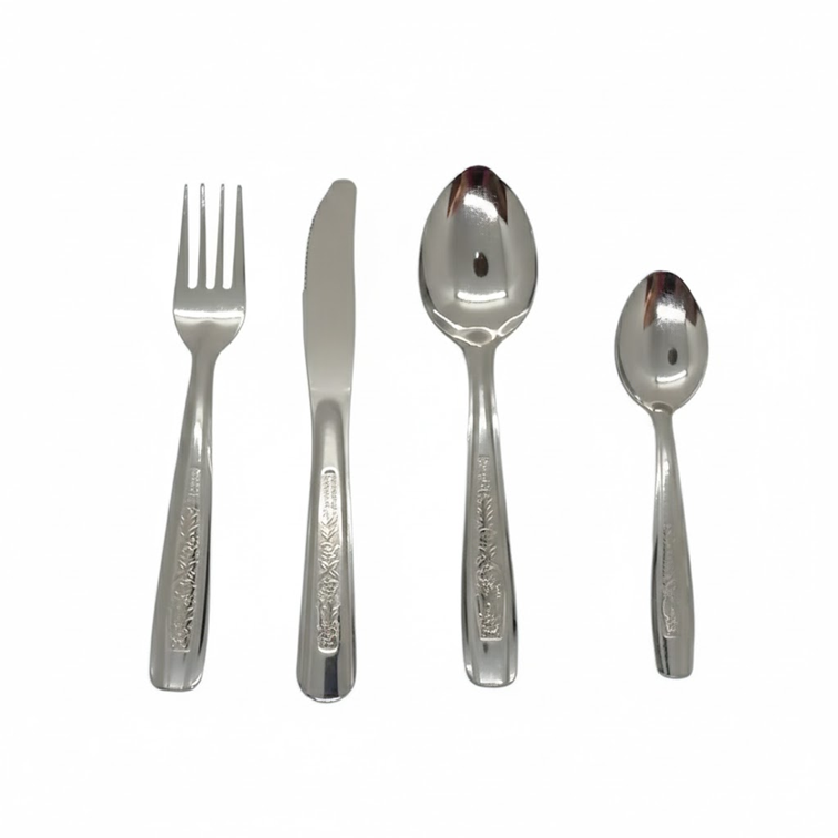 Tenedor: De tamaño estándar. Presenta cuatro púas bien definidas. El mango es robusto y ligeramente curvado, con el grabado decorativo floral.