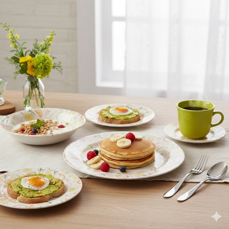 Plato de Postre: Pieza clave para el desayuno o meriendas, suele tener el diseño más tupido y alegre de la colección.