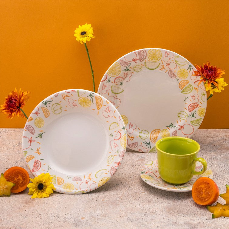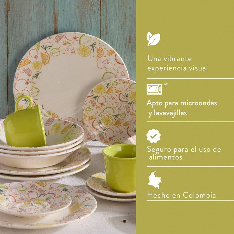Plato Pando: El borde está decorado con el motivo frutal, creando un anillo de color que resalta los alimentos en el centro.