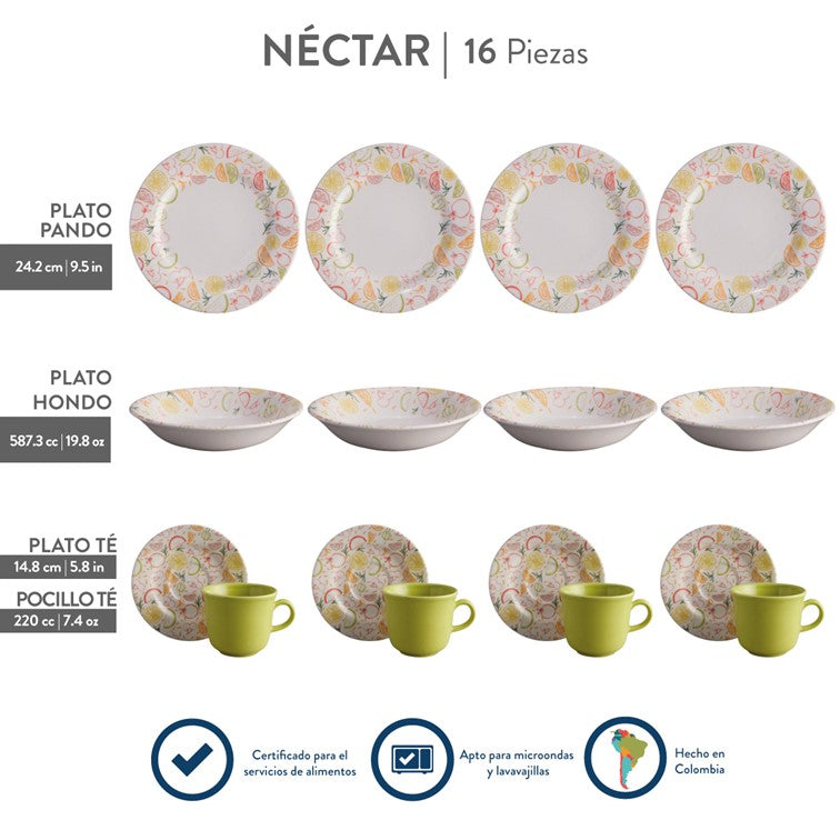 Mug o Pocillo: Una característica distintiva de la línea Néctar es que el mug suele ser de un color sólido vibrante (frecuentemente verde lima o naranja) por fuera, coordinando perfectamente con los gráficos de los platos.